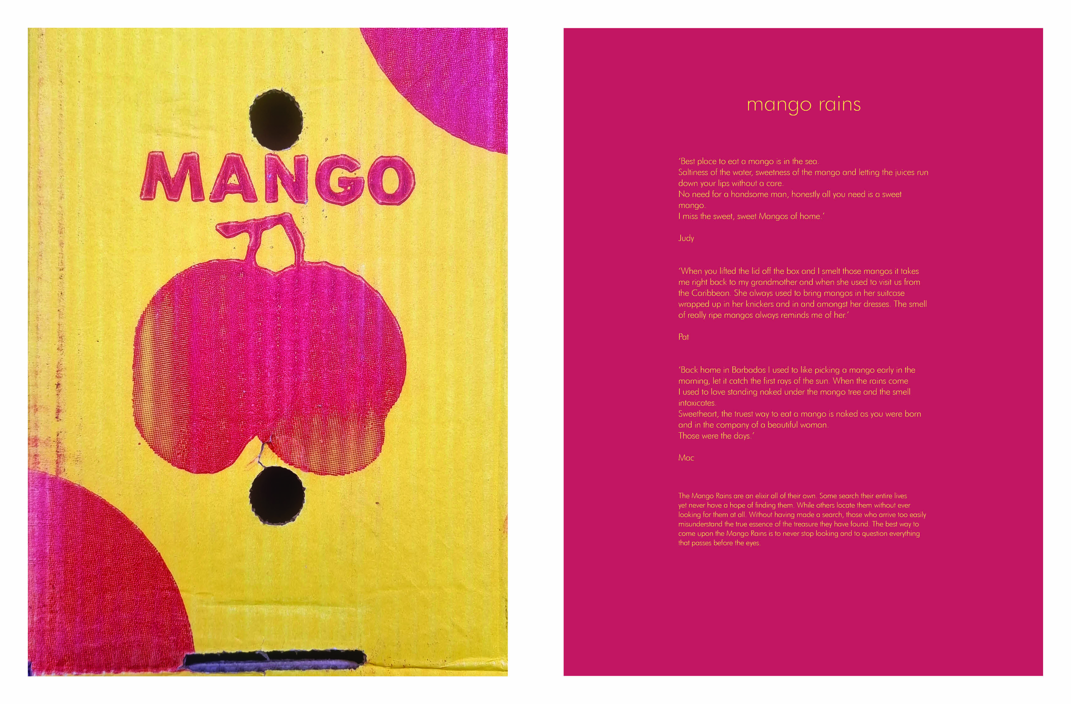 Within this box of 7 mangos there are 7 stories from 7 people. Recorded on a phone these conversations reveal a humorous insight into the life and memories of the interviewees. The richness and diversity of The Oxford Road is laid bare in these relaxed recordings The mangos being the catalyst to delve deep into the many different voices and personal histories.